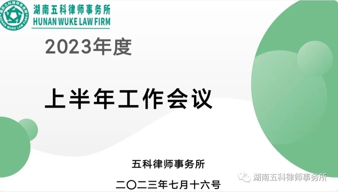 2023年7月16日上午,湖南五科律师事务所在怀化市鹤城区佳麓山庄会议室召开了2023年度上半年工作会议,未出差的执业律师、实习律师、实习生、行政及财务等人员参加了此次会议。
